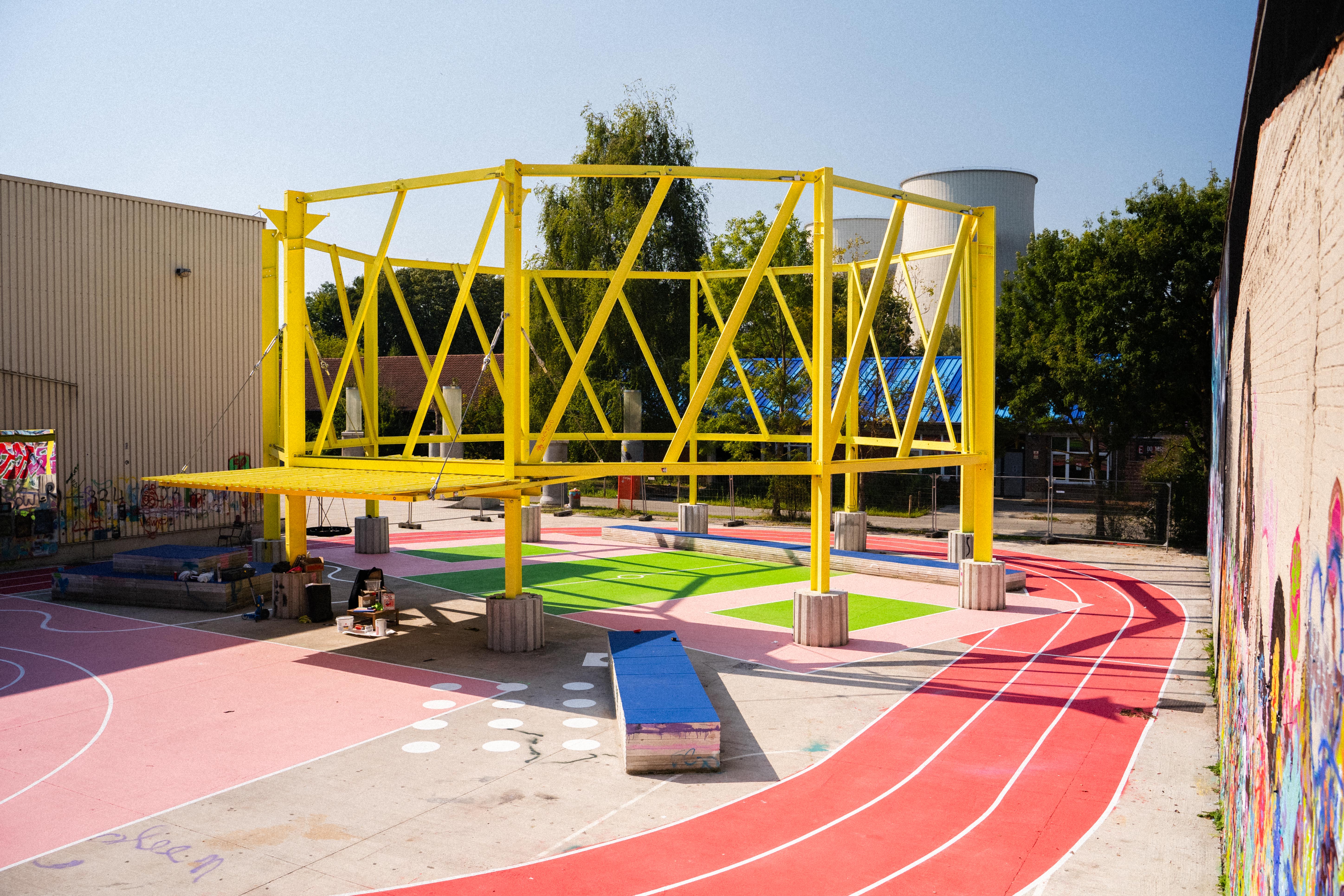 Par exemple, la Yellow Stage — la scène principale utilisée lors de l’édition de 2024 —, qui avait été construite à partir d’une ancienne structure de toit d’acier, a été transformée en un terrain de jeu pour la communauté après la clôture du festival. En effet, des terrains de sport ont été peints au sol et des balançoires ont été installées.