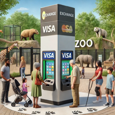Image représentant les visiteur(-euse)s d’un zoo utilisant des bornes pour échanger leur argent comptant contre des cartes prépayées. Image générée par l’intelligence artificielle générative.